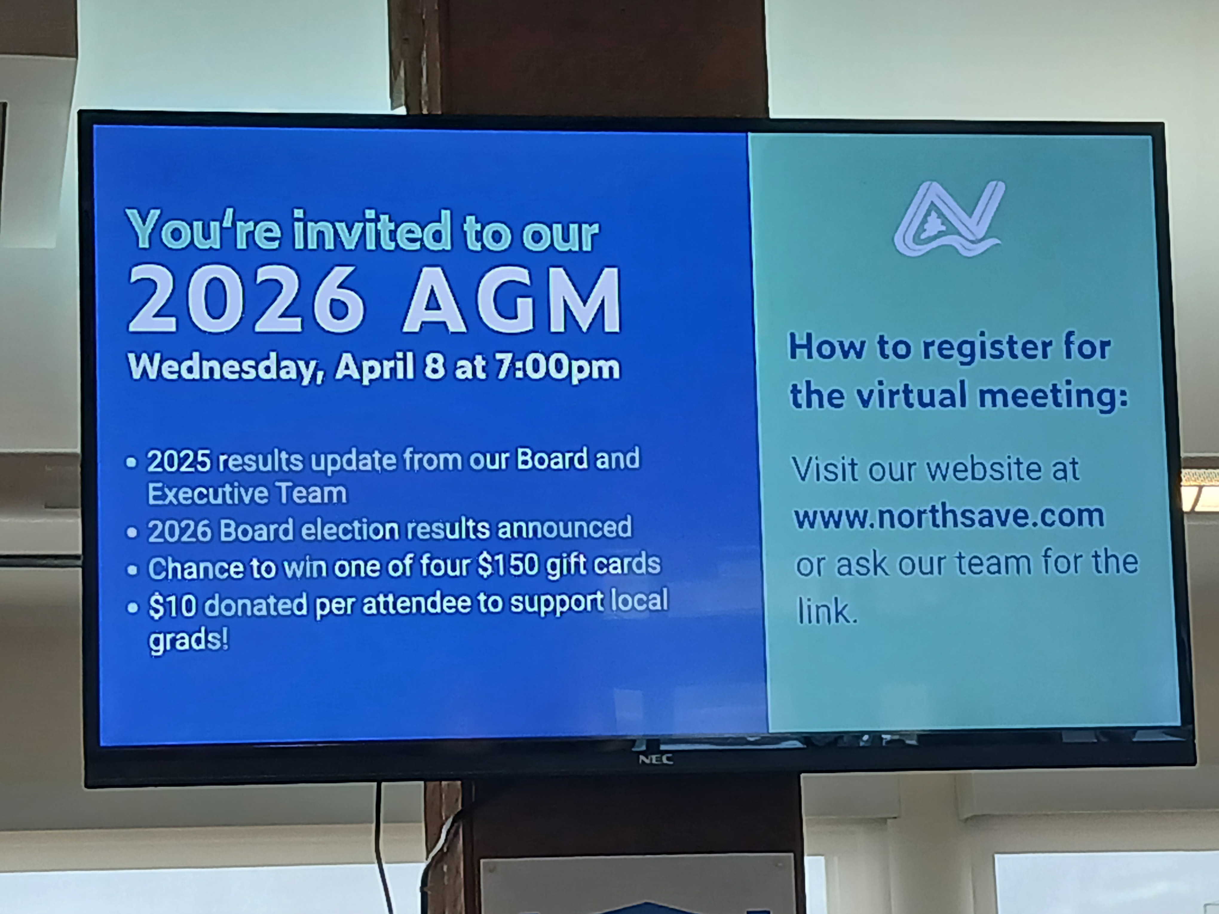 Results update from our Board and Executive team; Board election results announced; Chance to win 1 of 4 $150 gift cards; $10 donated per attendee to support local grads!